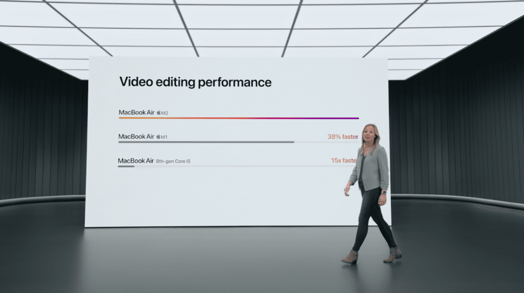 Gracias el nuevo chip M2, la nueva MacBook Air 2022 promete un 38% de mejor desempeño en edición de video respecto a la antigua con M1 y 15 veces más rápida que la MacBook Air con procesador iCore 5 de 8va generación.